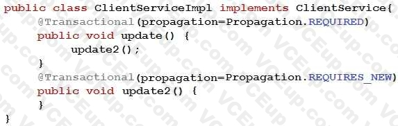 4. There is only one transaction initiated by update1() because the call to update2() does not go through the proxy.