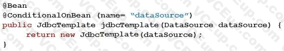 The above code shows a conditional @Bean method for the creation of a JdbcTemplate bean. Which two statements correctly describe the code behavior? (Choose two.)